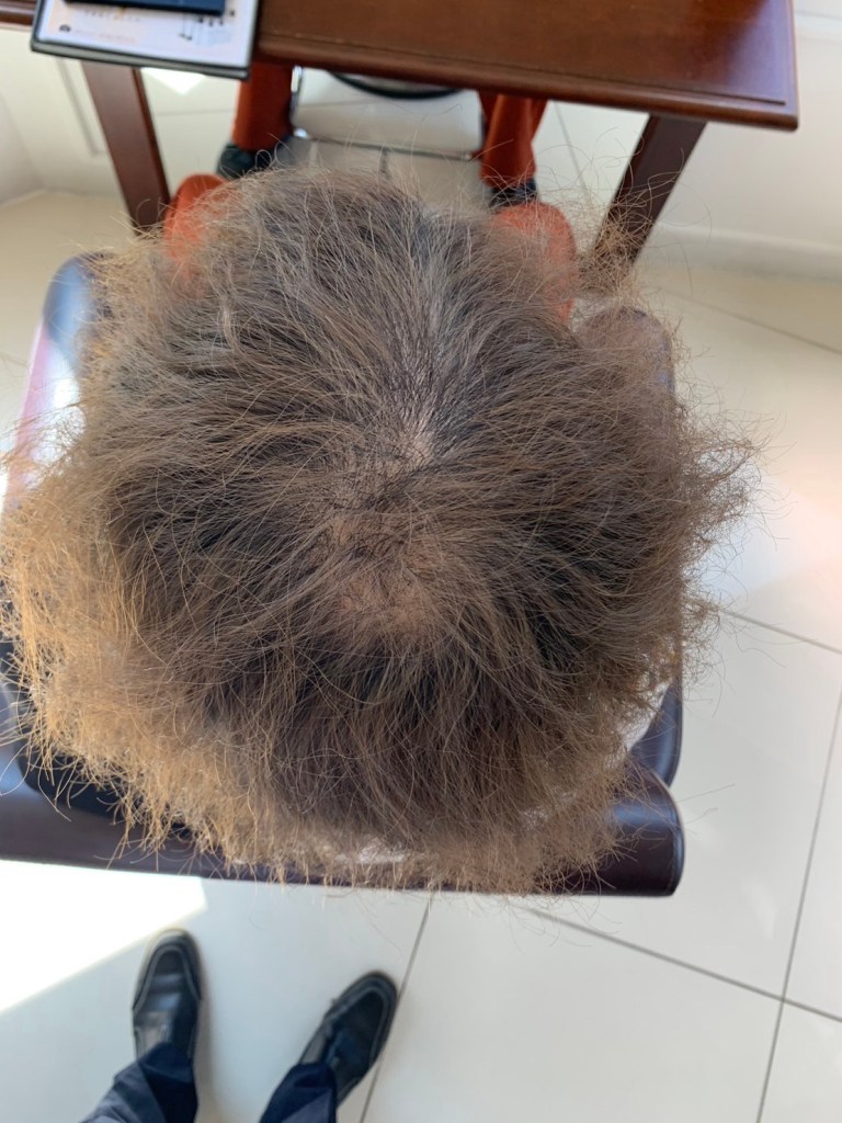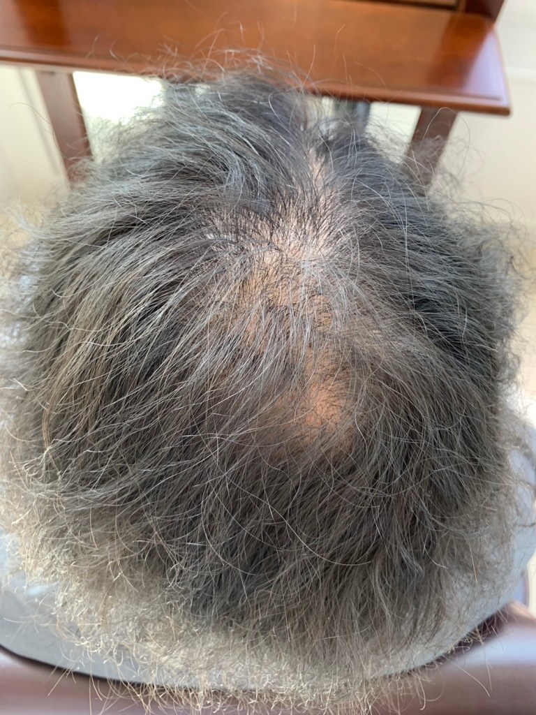 天頂部がしっかり埋まりました。彼の場合は、細くなっていた毛を根本から蘇らせた状態です。シャンプーとコンディショナーを頭皮に浸透させて使います。あとは継続あるのみ毎日使うシャンプーを変えるだけです。